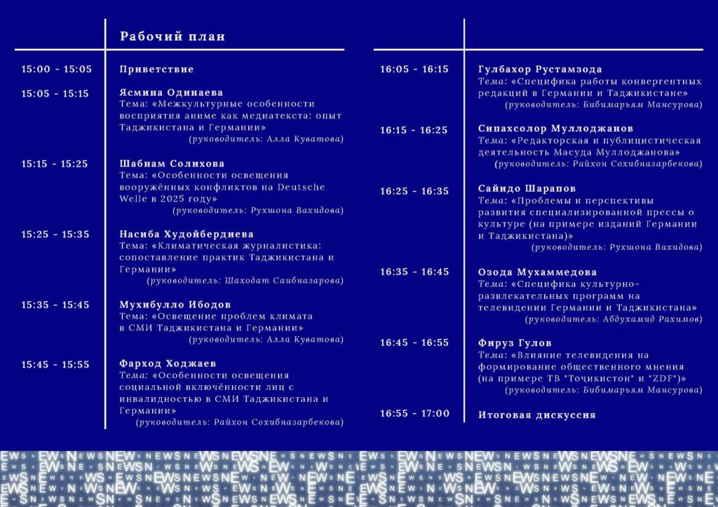 ПодробнееВ новом 2025-26 учебном году на магистерскую программу «Культура и медиа» успешно поступили десять студентов: Гулбахор Рустамзода Мухибулло Ибодов Насиба Худойбердиева Озода Мухаммедова Сайидо Шарапов Сипахсолор Муллоджанов Фарход Ходжаев Фируз Гулов Шабнам Солихова Ясмина Одинаева Занятие на 1 курсе начались 1 сентября. Расписание магистрантов 2025 Магистерская программа «Культура[…]